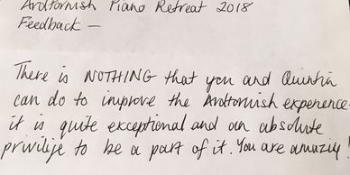 "Dear Anca and Quintin, Ardtornish was great! Top marks for the Piano Duet Extravaganza to start off the wonderful week of music. The group class was interesting and left me anticipating a follow up rhythm session. I found listening to music with Gillian very informative. I liked taking part and listening to both the informal concert and chamber music afternoon. The final concert was exciting with beautiful music from the retreaters. Roxana and Anca’s concert was absolutely beautiful and I would be delighted to have Roxana give a lesson to the group sometime. My thanks to you all for another memorable time at Ardtornish. Your energy, enthusiasm and encouragement is inspiring!"